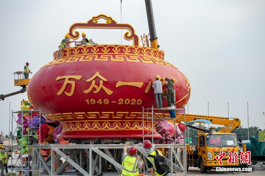 9月21日,园林工人在北京天安门广场搭建“祝福祖国”主题花坛。“祝福祖国”主题花坛以喜庆的花果篮为主景,篮内摆放有花卉以及富有吉祥寓意的果实。9月15日,北京市园林绿化局公布了2020年国庆天安门广场及长安街沿线花卉布置方案。天安门广场中心将布置“祝福祖国”巨型花果篮,长安街沿线建国门至复兴门也将布置10处各具特色的主题花坛。花卉布置工作于9月16日凌晨进场施工,预计9月25日左右完工亮相。 中新社记者 田雨昊 摄