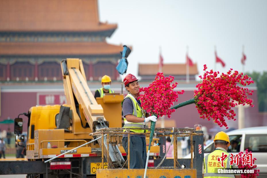 9月21日,园林工人在北京天安门广场搭建“祝福祖国”主题花坛。中新社记者 田雨昊 摄
