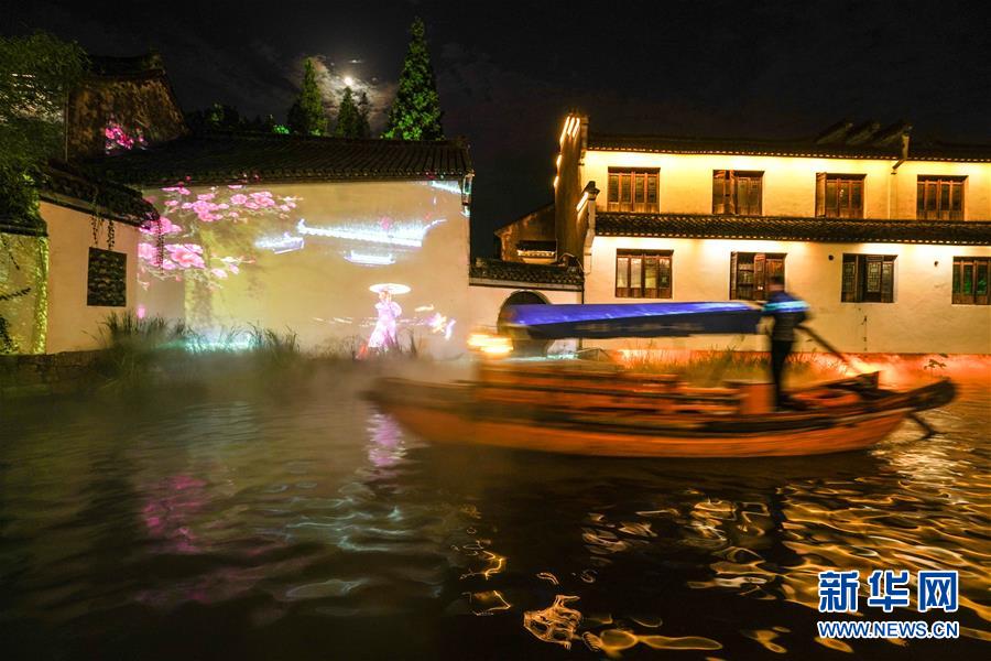 9月28日,一艘游船划过灯光璀璨的水巷。 当日,2020海峡两岸(昆山)中秋灯会在江苏昆山开幕,为期一个月。灯会设置的水乡周庄灯区以水乡、古镇、田园江南为依托,将传统彩灯与现代光影艺术相融合,打造“水韵芳华”夜周庄。 新华社记者 杨磊 摄