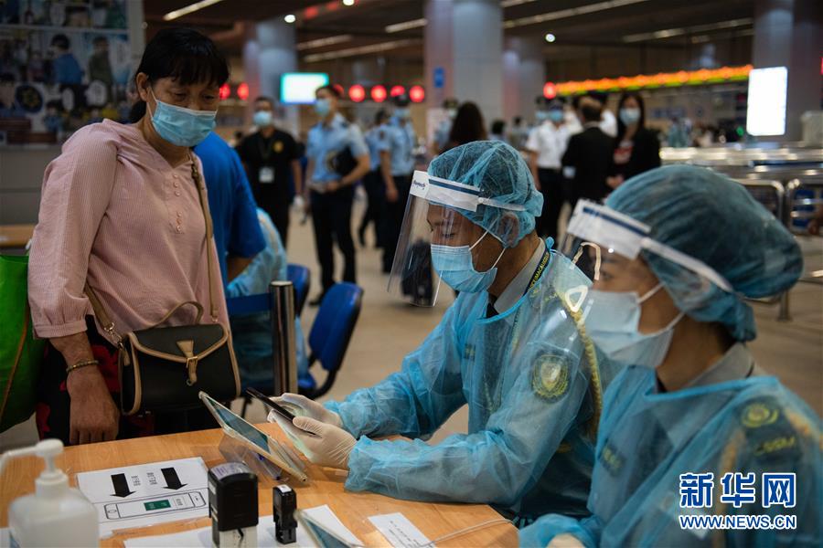 9月29日,工作人员在澳门关闸口岸协助抵澳人士填写澳门健康码。新华社记者 张金加 摄