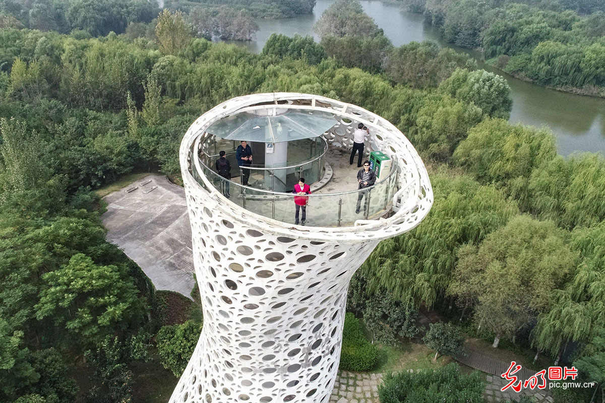 2020年9月26日,游人在陕西省西安市浐灞国家湿地公园观鸟塔取景拍摄。浐灞国家湿地公园位于西安市东北部,占地面积4700亩。作为“都市自然保护区,湿地动植物天然栖息地,鸟类自由乐园”,浐灞湿地公园成为西安市靓丽的城市名片。(光明网记者 邵绪楠摄/光明图片)