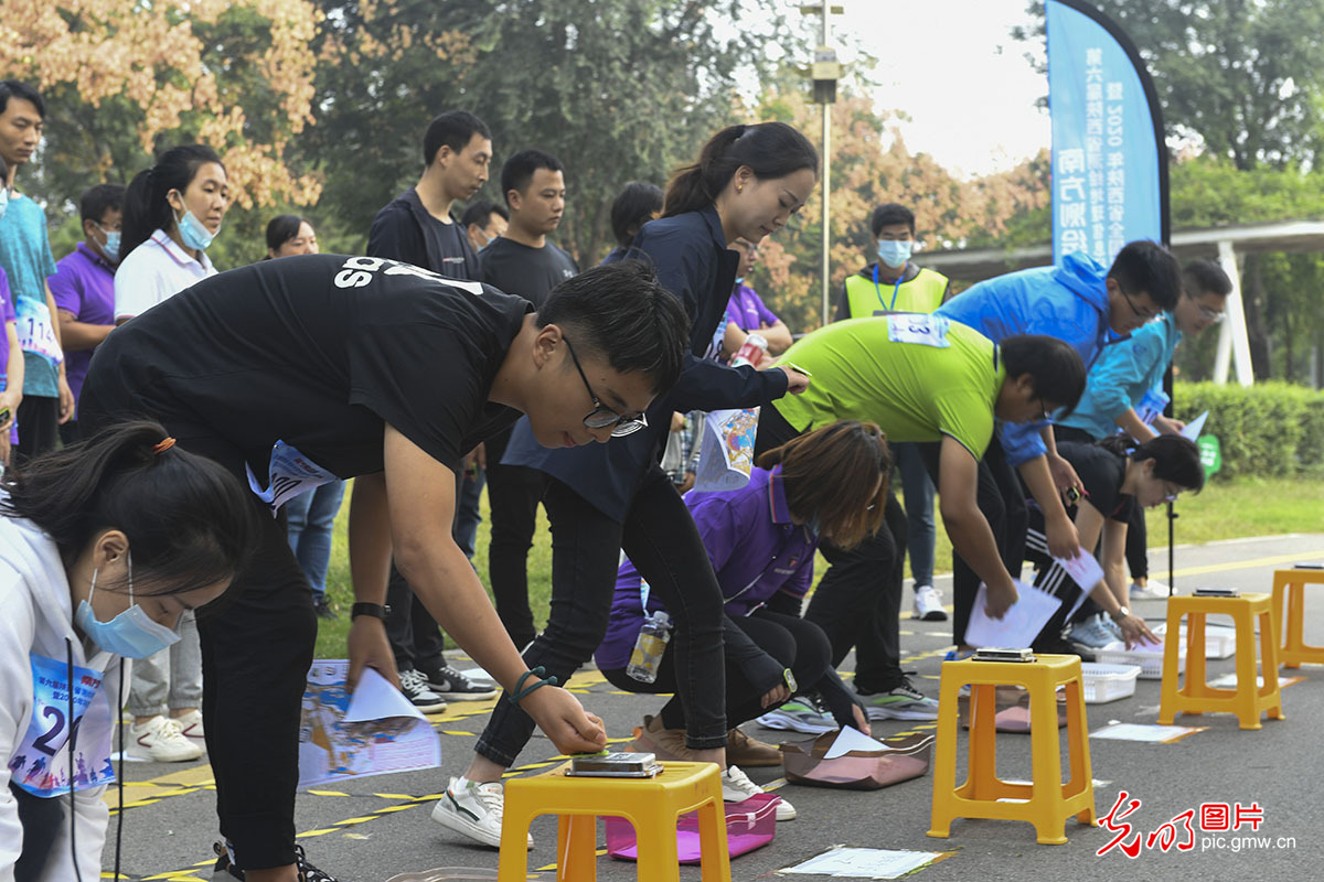 2020年9月26日,在陕西省西安市浐灞国家湿地公园,定向越野参赛者在起点打卡参赛。浐灞国家湿地公园位于西安市东北部,占地面积4700亩。作为“都市自然保护区,湿地动植物天然栖息地,鸟类自由乐园”,浐灞湿地公园成为西安市靓丽的城市名片。(光明网记者 邵绪楠摄/光明图片)