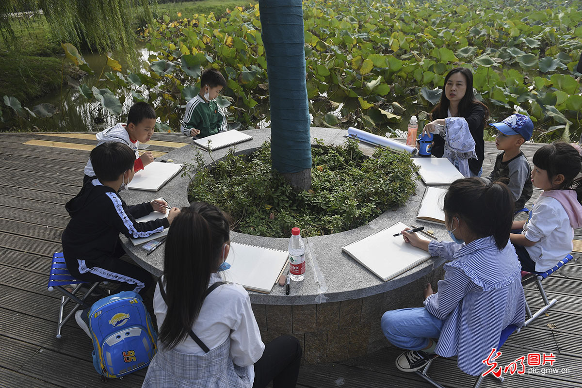2020年9月26日,小朋友在陕西省西安市浐灞国家湿地公园绘画荷花。浐灞国家湿地公园位于西安市东北部,占地面积4700亩。作为“都市自然保护区,湿地动植物天然栖息地,鸟类自由乐园”,浐灞湿地公园成为西安市靓丽的城市名片。(光明网记者 邵绪楠摄/光明图片)