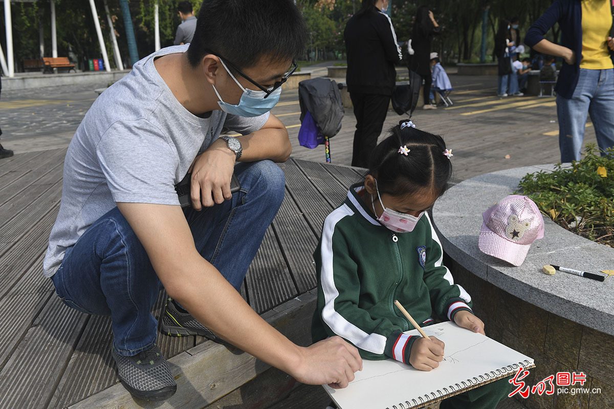 2020年9月26日,家长指导小朋友在陕西省西安市浐灞国家湿地公园绘画荷花。浐灞国家湿地公园位于西安市东北部,占地面积4700亩。作为“都市自然保护区,湿地动植物天然栖息地,鸟类自由乐园”,浐灞湿地公园成为西安市靓丽的城市名片。(光明网记者 邵绪楠摄/光明图片)