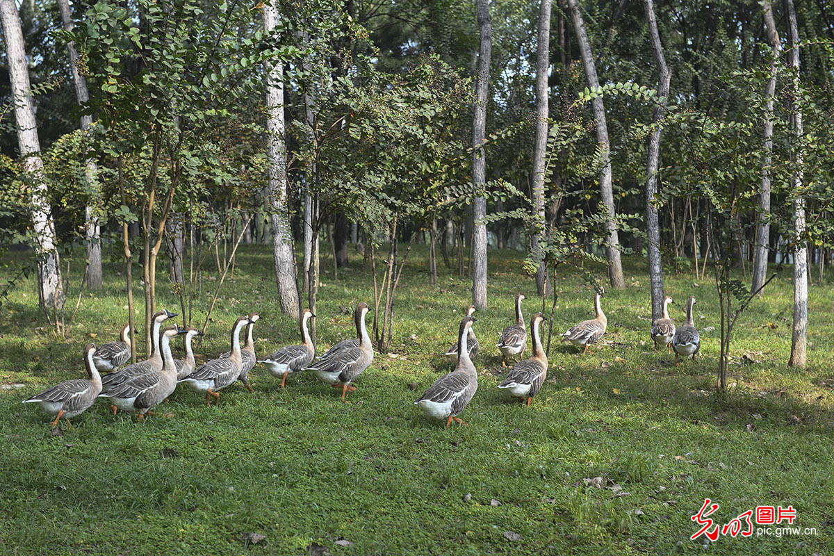 2020年9月26日,鸿雁在陕西省西安市浐灞国家湿地公园散步。浐灞国家湿地公园位于西安市东北部,占地面积4700亩。作为“都市自然保护区,湿地动植物天然栖息地,鸟类自由乐园”,浐灞湿地公园成为西安市靓丽的城市名片。(光明网记者 邵绪楠摄/光明图片)