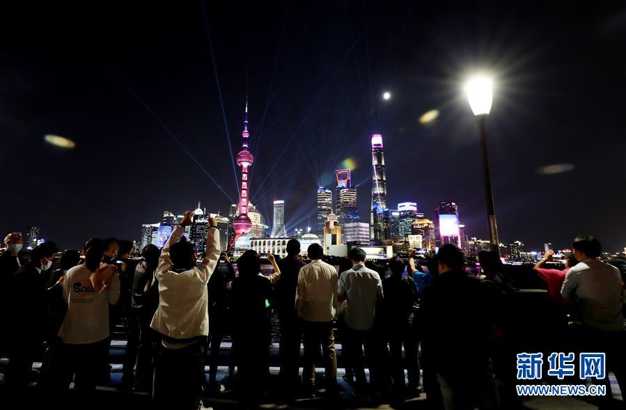 9月30日,游客在上海外滩欣赏灯光秀。 近日,上海天气凉爽宜人,不少市民和游客在夜间出游,领略城市美丽的夜色。 新华社记者 方喆 摄