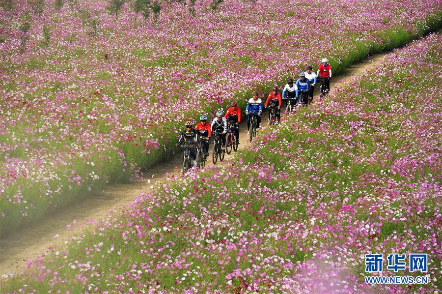 10月1日,游客在河北省河间市景和镇丰尔庄园景区骑车游览。 当日是国庆节和中秋节,全国各地的人们用各种方式欢度节日。 新华社记者 朱旭东 摄