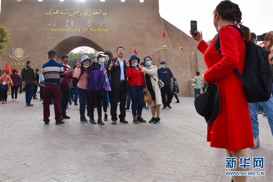 10月1日,游人在新疆喀什古城景区合影。 当日是国庆节和中秋节,全国各地的人们用各种方式欢度节日。 新华社记者 高晗 摄