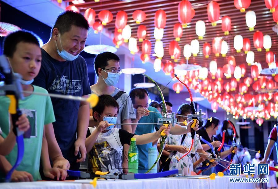 10月1日,小朋友和家长在位于海口市的海南省博物馆体验射箭游戏。 当日是国庆节和中秋节,全国各地的人们用各种方式欢度节日。 新华社记者 郭程 摄