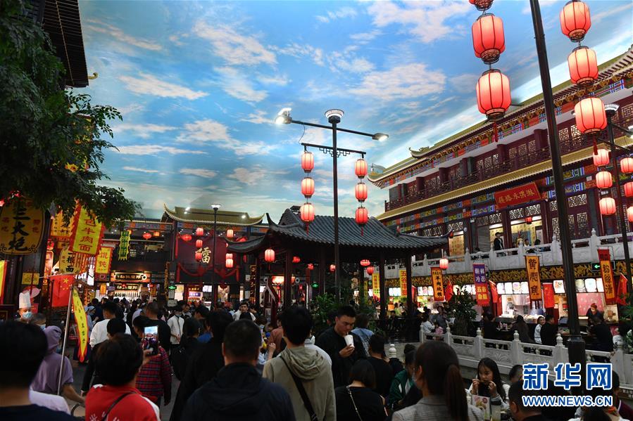 10月2日,游客在开封小宋城内品尝小吃。 国庆长假期间,河南省开封市通过延长景区开放时间、举办夜间文化活动、规范夜市经营等措施,鼓励引导夜间旅游、文化、餐饮等活动,提升城市夜间活力,吸引了众多游客前来参观游玩。 新华社记者 李嘉南 摄