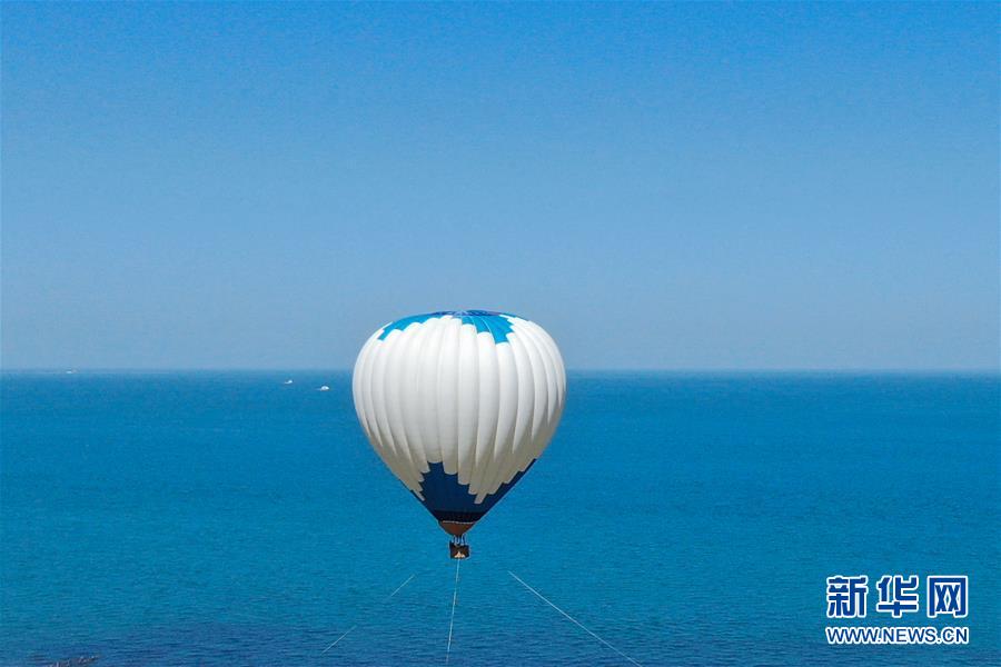 9月23日,游客在青海湖边乘坐热气球游玩(无人机照片)。 新华社记者 张龙 摄