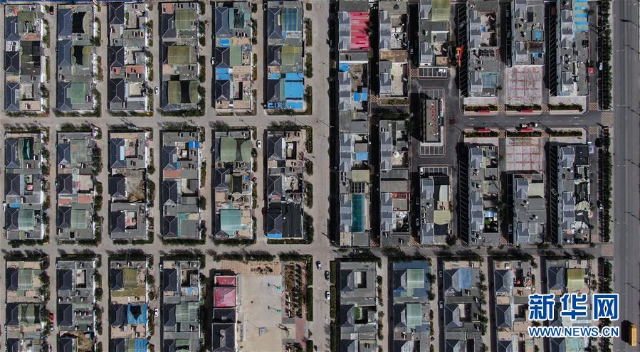 这是9月22日拍摄的青海省海西蒙古族藏族自治州乌兰县茶卡镇巴音村,当地村民依托茶卡盐湖旅游资源,经营家庭宾馆和农家乐(无人机照片)。 新华社记者 张龙 摄