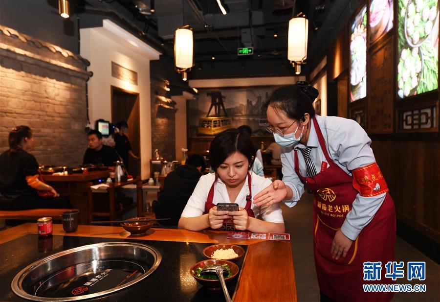 10月5日,重庆来福士一家老火锅餐厅的“文明点菜员”(右一)向消费者推荐“小份菜”。 中秋和国庆长假期间,重庆火锅迎来消费高峰,不少火锅店通过投放电子屏宣传标语、放置宣传海报、设置“文明点菜员”、推出“小份菜”等方式,引导消费者适量点菜、文明用餐,倡导“厉行节约、反对浪费”的消费理念。 新华社记者 王全超 摄