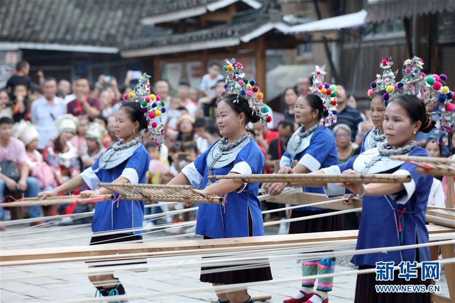 10月2日,侗族群众在三江侗族自治县林溪镇程阳八寨景区表演侗族纺纱。 2014年贵广高铁开通运营以来,广西柳州市三江侗族自治县依托少数民族风情资源优势,全力做好旅游扶贫,使三江快速融入“大桂林”旅游经济圈。 新华社发(龚普康 摄)