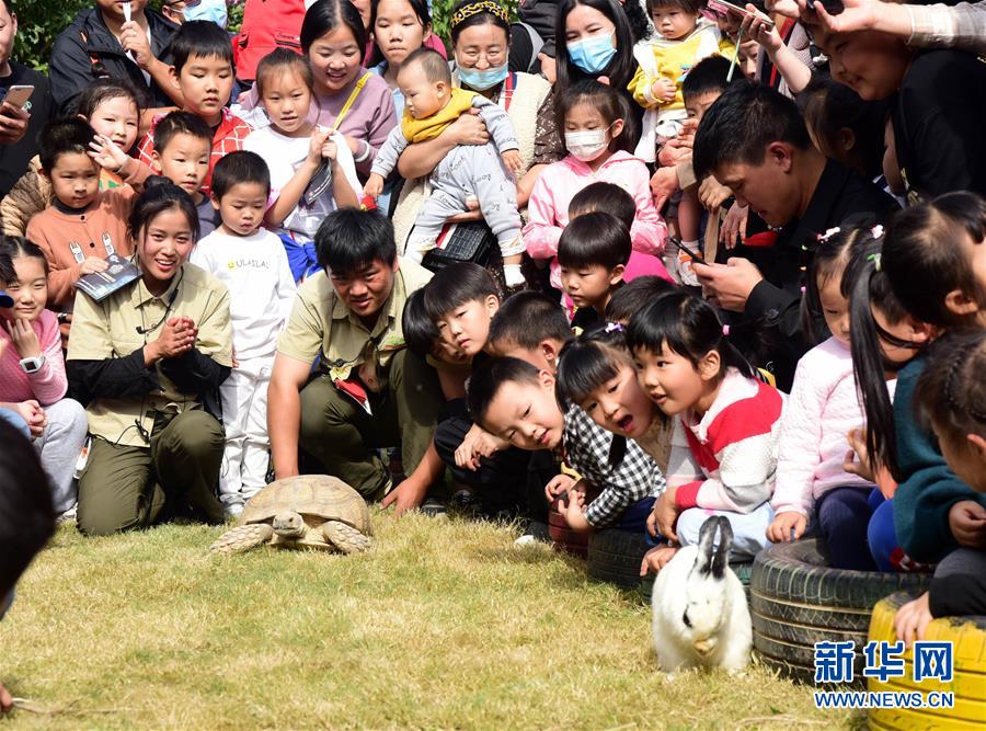 10月7日,游客在观看“龟兔赛跑”游戏。 国庆长假期间,众多游客来到河南省郑州市一家森林动物乐园观赏游玩,亲近动物,乐享假期。 新华社记者朱祥摄