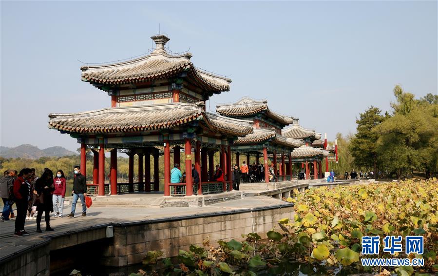 10月8日,游客在承德避暑山庄游玩。 寒露时节,河北承德避暑山庄展现出一幅幅色彩斑斓的美丽画卷,吸引游人前来观赏秋景。 新华社发(刘环宇 摄)