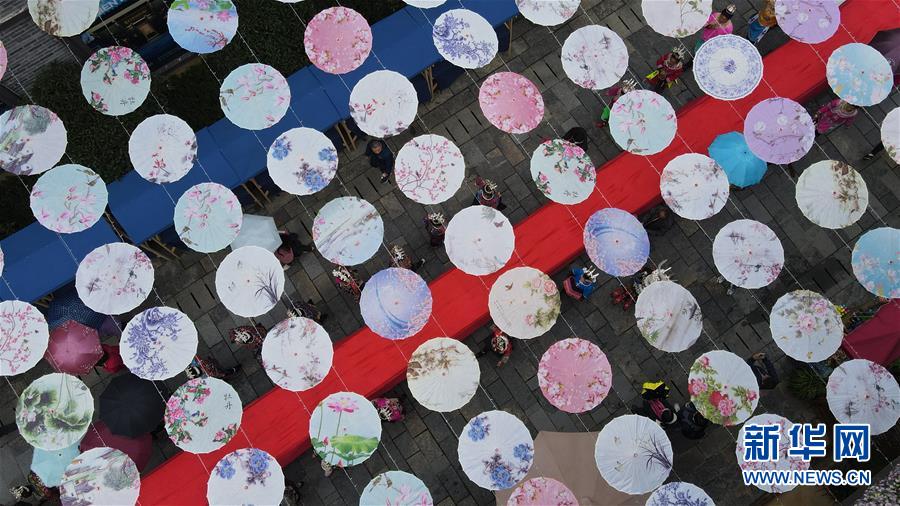 10月17日,身着盛装的苗族群众在贵州省黔东南苗族侗族自治州丹寨县万达小镇参加服饰巡游(无人机照片)。 在贵州省黔东南苗族侗族自治州丹寨县万达小镇景区,当地苗族群众每逢周末及节假日,都会穿上传统节日盛装,集中展示当地多个支系、不同风格的苗族传统服饰,让游客大饱眼福。丹寨县苗族“嘎闹”支系服饰入选第二批国家级非物质文化遗产名录。 新华社记者 杨楹 摄