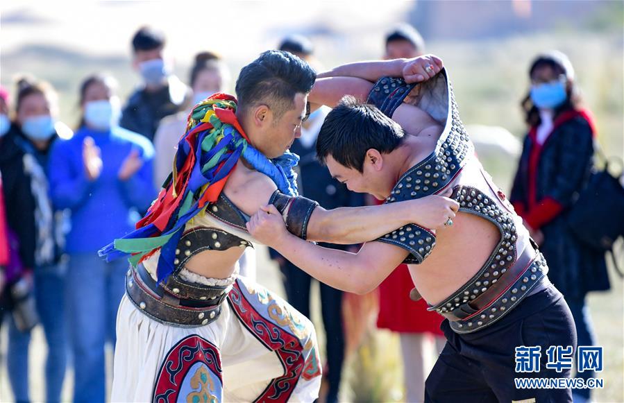 10月21日,一名游客(右)在阿拉善通湖草原旅游区民俗旅游项目中体验搏克。 金秋时节,内蒙古阿拉善盟依托当地独特的自然风光和旅游资源,持续推出减免景区门票、发放旅游优惠券、开行旅游包机专列、构建毗邻区域环线游等措施,提升旅游供给能力和服务质量,吸引大量游客前来观光游览。 新华社发(王正 摄)