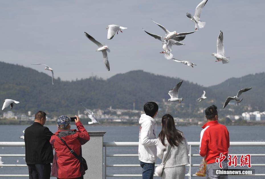 10月23日,云南昆明,游客用手机拍摄红嘴鸥。近日,从西伯利亚飞抵昆明越冬的红嘴鸥开始靠岸滇池,与市民游客近距离接触。 中新社记者 刘冉阳 摄