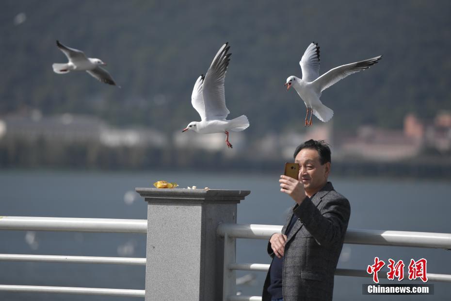 10月23日,云南昆明,一名游客与红嘴鸥拍照。 中新社记者 刘冉阳 摄