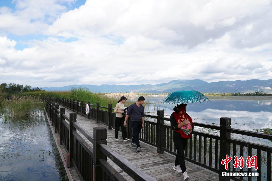 10月25日,“同饮一江水、共话澜湄情”2020澜湄万里行中外媒体采访团来到云南省保山市,参观青华海国家湿地公园。青华海历史悠久,远古时期曾为一片海洋,明代文学家杨慎谪居保山时,取“东极青华大地”之意将其命名为“青华海”。 由于围湖造田、治理水患等原因,青华海湿地一度退化。近年来,保山市坚持“山水林田湖草”系统治理,于2016年底建设青华海国家湿地公园,目前已成为民众共享的绿意空间。青华海位于国际候鸟迁徙路线的交叠区域,随着湿地环境的恢复与改善,吸引了包括世界极危鸟类青头潜鸭在内的2万余只候鸟到此地越冬。中新社记者 苏丹 摄