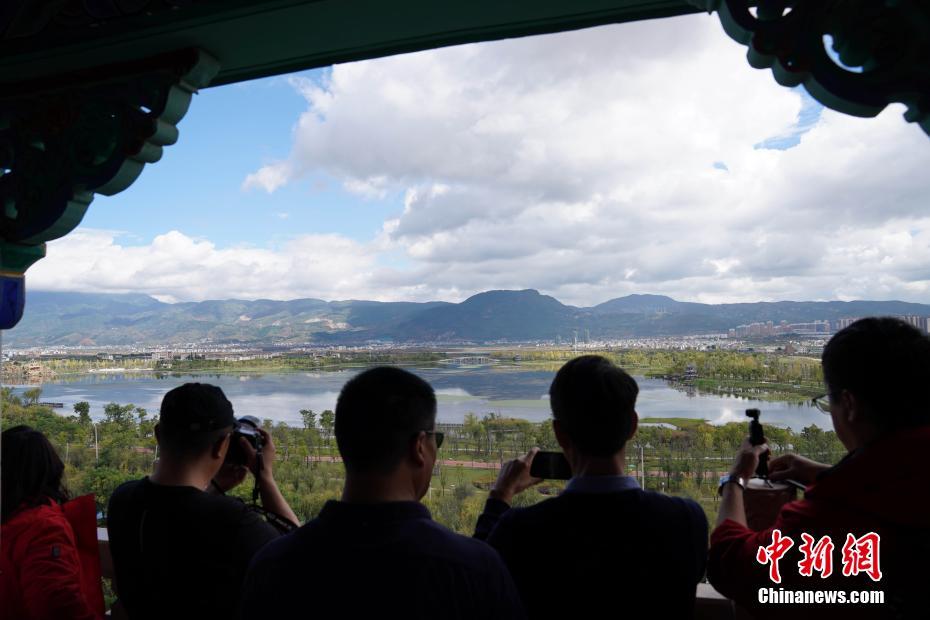 10月25日,“同饮一江水、共话澜湄情”2020澜湄万里行中外媒体采访团来到云南省保山市,参观青华海国家湿地公园。青华海历史悠久,远古时期曾为一片海洋,明代文学家杨慎谪居保山时,取“东极青华大地”之意将其命名为“青华海”。 由于围湖造田、治理水患等原因,青华海湿地一度退化。近年来,保山市坚持“山水林田湖草”系统治理,于2016年底建设青华海国家湿地公园,目前已成为民众共享的绿意空间。青华海位于国际候鸟迁徙路线的交叠区域,随着湿地环境的恢复与改善,吸引了包括世界极危鸟类青头潜鸭在内的2万余只候鸟到此地越冬。中新社记者 苏丹 摄