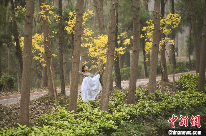 10月27日,一位游客身穿汉服在秋色中拍照留影。 韩苏原 摄