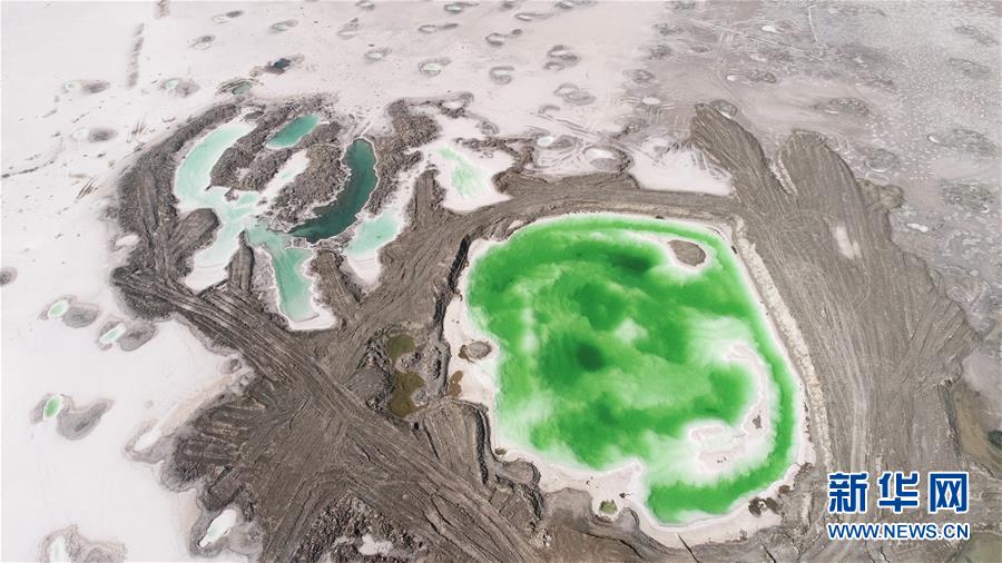 这是10月30日拍摄的翡翠湖景色(无人机照片)。 翡翠湖位于青海省海西蒙古族藏族自治州,由于湖底深浅不一、所含矿物质浓度不同,湖水呈现不同深度的绿色,宛若镶嵌在戈壁上的“绿宝石”。 新华社记者 赵玉和 摄
