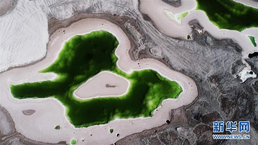 这是10月30日拍摄的翡翠湖景色(无人机照片)。 翡翠湖位于青海省海西蒙古族藏族自治州,由于湖底深浅不一、所含矿物质浓度不同,湖水呈现不同深度的绿色,宛若镶嵌在戈壁上的“绿宝石”。 新华社记者 赵玉和 摄