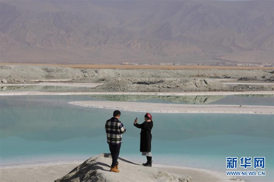 10月30日,游客在翡翠湖边拍照留念。 翡翠湖位于青海省海西蒙古族藏族自治州,由于湖底深浅不一、所含矿物质浓度不同,湖水呈现不同深度的绿色,宛若镶嵌在戈壁上的“绿宝石”。 新华社记者 央秀达珍 摄