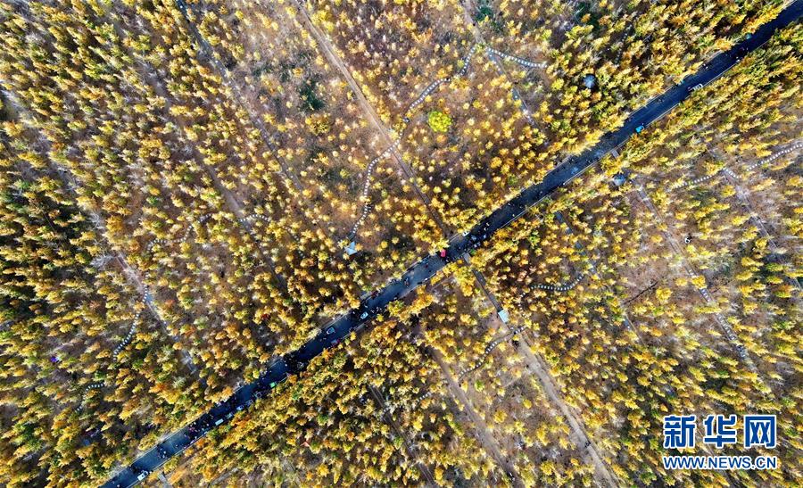 游客在曲周县银杏种植基地游览(11月2日摄,无人机照片)。 眼下,河北省邯郸市曲周县银杏种植基地近千亩银杏林进入最佳观赏期,吸引众多游客前来游览。 新华社记者 朱旭东 摄