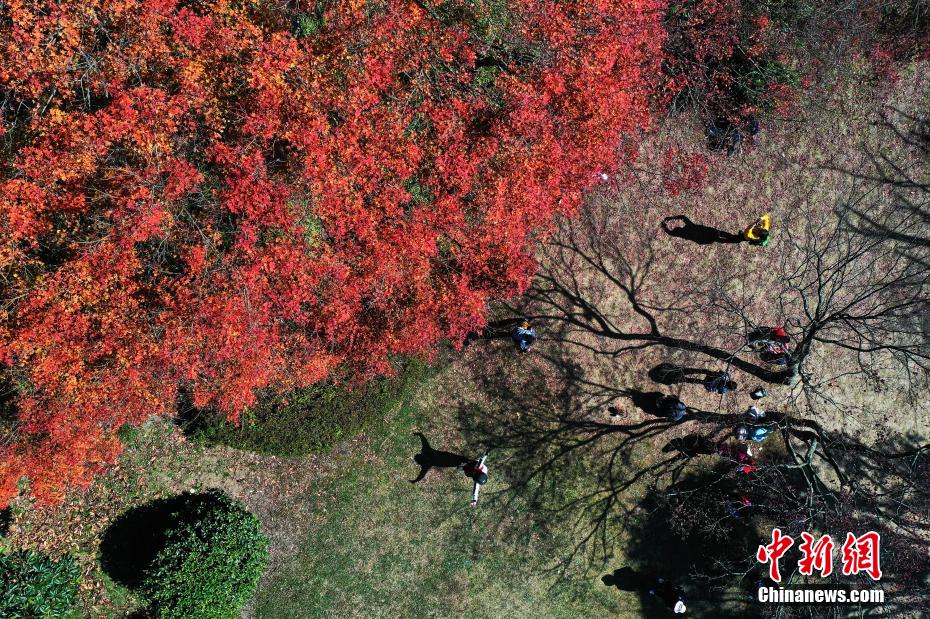 图为游客在庐山植物园内欣赏红枫,拍照留念。 刘占昆 摄