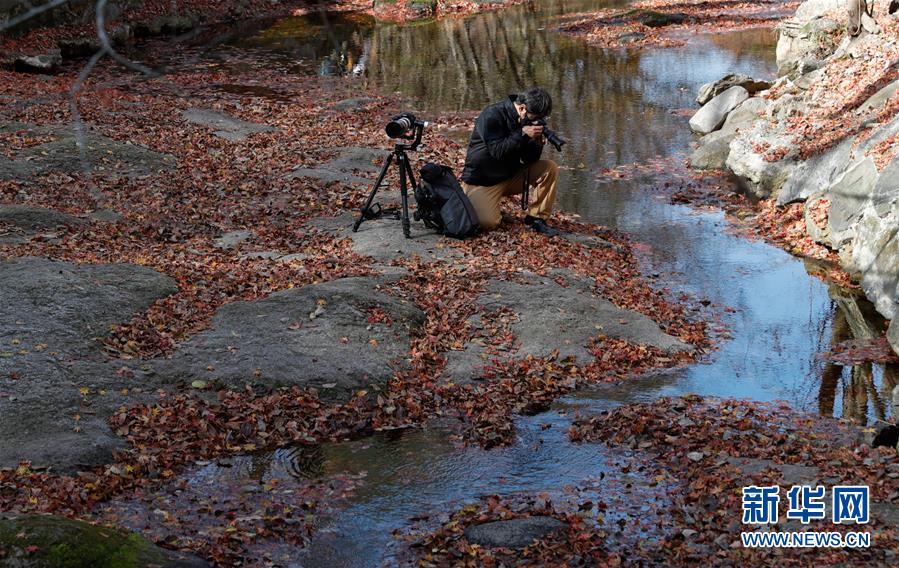 11月8日,在韩国全罗北道井邑市,一名游客在内藏山拍摄落入水中的枫叶。 位于韩国全罗北道井邑市的内藏山是韩国著名的赏枫地。深秋的周末,不少韩国民众来到内藏山欣赏“枫景”。 新华社记者 王婧嫱 摄