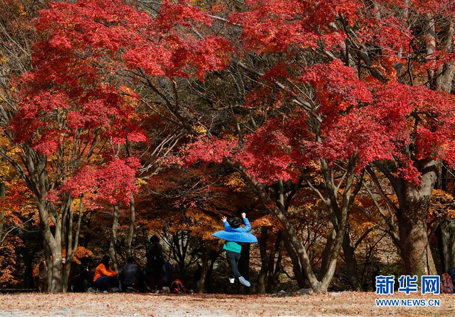 11月8日,在韩国全罗北道井邑市,一个小男孩在内藏山枫树下玩耍。 位于韩国全罗北道井邑市的内藏山是韩国著名的赏枫地。深秋的周末,不少韩国民众来到内藏山欣赏“枫景”。 新华社记者 王婧嫱 摄