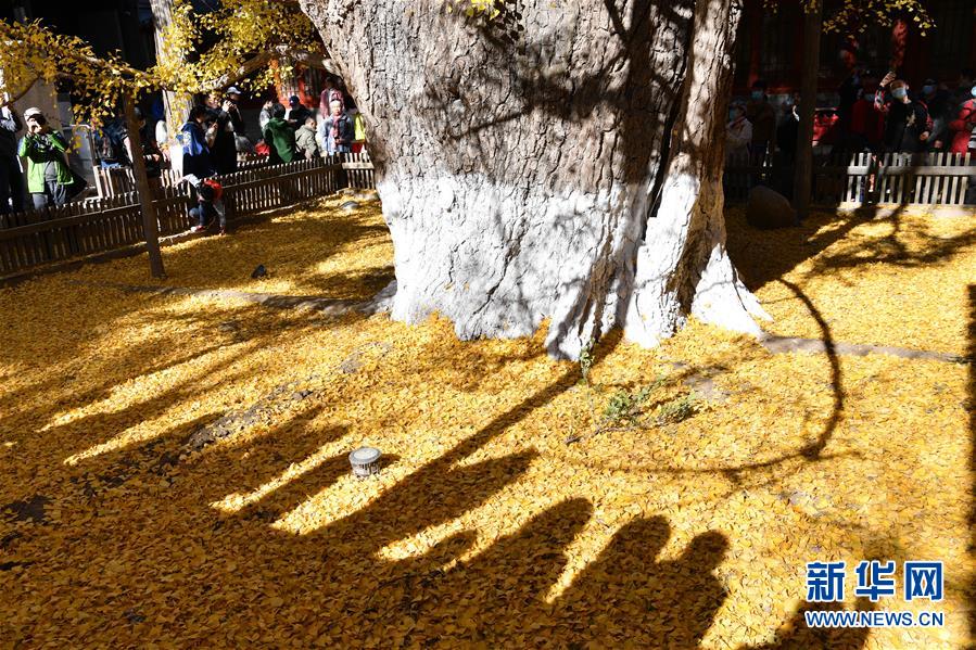 11月8日,游客在大觉寺观赏古银杏黄叶。 位于北京市海淀区的大觉寺始建于辽代,寺内一株古银杏树龄已逾千年,至今枝繁叶茂,被誉为“银杏树王”。每年秋末冬初都吸引不少游客前来观赏。 新华社记者 尹栋逊 摄