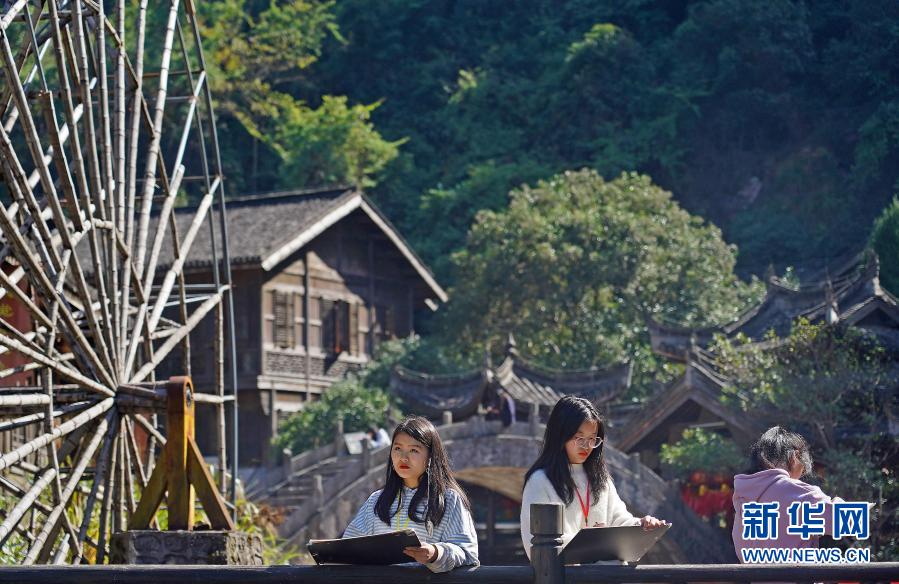 11月11日,来自景德镇的大学生在大觉山风景区大觉古镇采风写生。