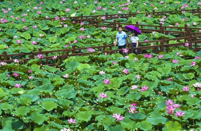 时值夏日,河北省曲周县胜丰莲藕种植专业合作社荷塘景区的荷花竞相绽放,吸引众多游人前来观光游览。
