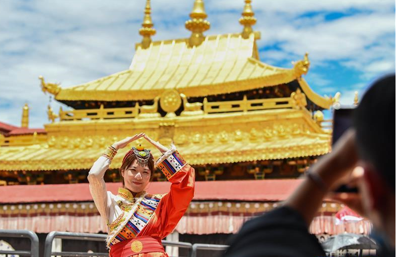 7月2日,游客在大昭寺金顶前留影。当日起,在暂停对外开放五个多月后,西藏大昭寺恢复对外开放。