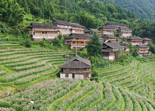 近日,广西龙胜各族自治县泗水乡周家村布尼梯田种植的近千亩鲜花竞相开放,美不胜收。
