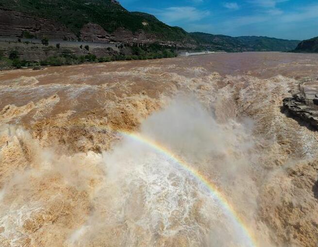 近日,位于秦晋大峡谷的黄河壶口瀑布出现难得一见的“金色瀑布”景观。