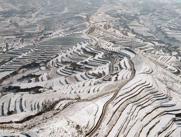 受冷空气影响,甘肃省定西市10月27日迎来降雪。雪后的黄土高原银装素裹,村庄和梯田构成一幅水墨画卷。