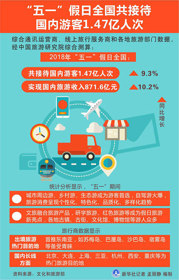 图表:“五一”假日全国共接待国内游客1.47亿人次 新华社记者 孟丽静 编制