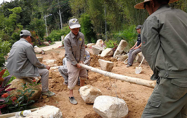林场绿化规划、改建、买苗、搬石、挖池等等,一年下来,近四十亩的黄土披上了绿装。陈泽锋指着场里的一个水池说,这个水池约两百平方米,不算大,但这里所用的石头,全是大家手工从山上搬来的,有的大石头足足几百斤,从山上搬下来的石头共超过一千吨。水池对面有一片漂亮的荔枝园,计划用石头在其中铺设栈道。为什么搬石?主要由于绿化栽花种树之地全是风化石,旱来硬如磐石,雨来积水不渗,要大量回填土才能保证花木成活。另外,也是为节约资金。