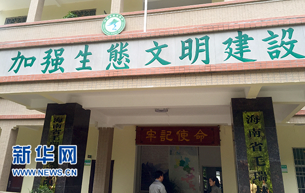 海南省毛瑞林场办公楼前刻着“加强生态文明建设”字样。 新华网 郭香玉 摄