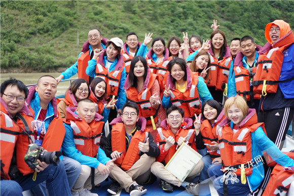 百家网媒酉阳行的记者们在乌江游船上开心合影 见习记者冉桐摄