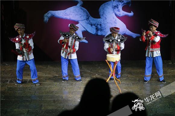 四位苗族演员表演《梯玛古歌》节目“耍锣鼓” 记者李文科摄
