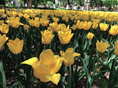 今年园内种植郁金香30万株,共有7个色系29个品种,其中包括了荷兰美人、奥利斯、亚威农等特色品种。竞相开放的花把公园衬托得多姿多彩,不少市民专门前来拍照。