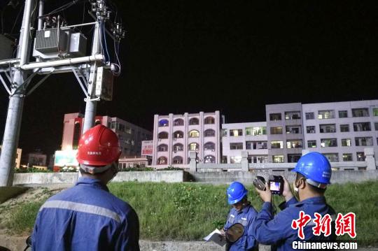 图为海南文昌供电局工作人员对高考保电线路进行夜间巡温。 余盛达 摄