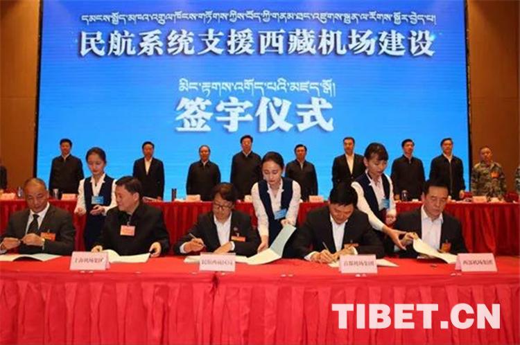 图为民航西藏区局与民航西南地区管理局、首都机场集团、上海机场集团、西部机场集团有限公司签订项目建设框架协议和委托援建协议。摄影:姚海全