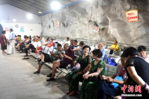 6月27日,福州气象局继续发布高温橙色预警,当日,福州市的大部分县(市)有35℃以上的高温。图为福州民众在防空洞纳凉。吕明 摄